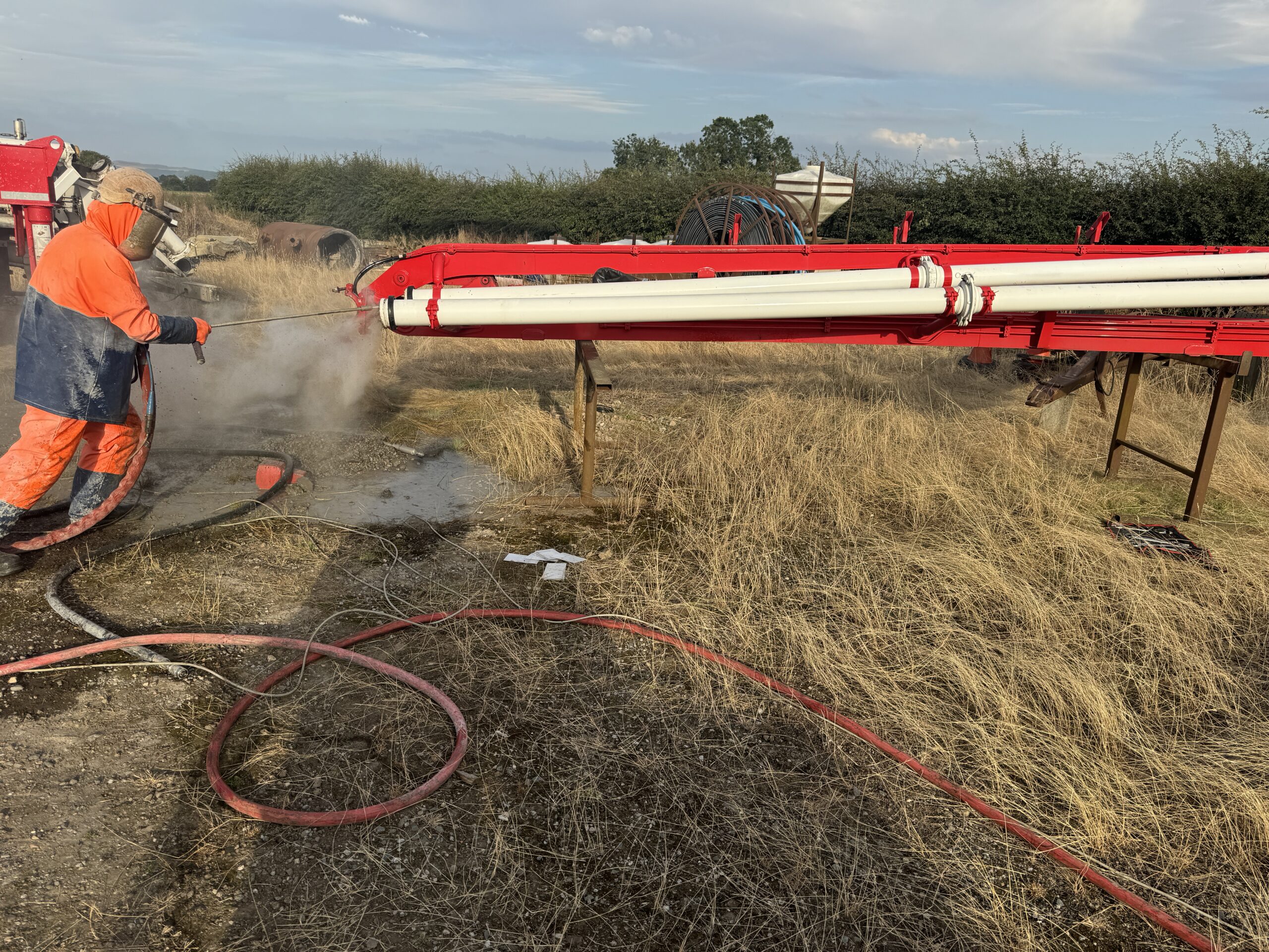 This process is particularly important for concrete delivery companies, ready-mix suppliers and civil engineering contractors operating concrete pumps, boom pumps, volumetric mixers and delivery wagons. Transfer lines, pipework and discharge systems are regularly exposed to setting material that can harden rapidly if not properly maintained. Routine cleaning helps prevent costly blockages, reduce downtime, maintain pumping performance and extend the working life of pumps, wagons and associated equipment, ensuring reliable operation on site.